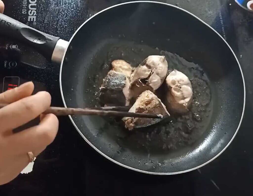 • Cho 800g cá vào chảo, chiên mỗi mặt 2–3 phút đến khi da cá vàng nhạt, thịt bên trong trắng săn – không cần chiên quá kỹ để tránh cá khô và mất độ ngọt tự nhiên.