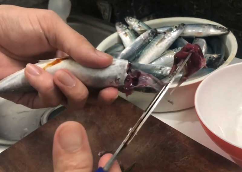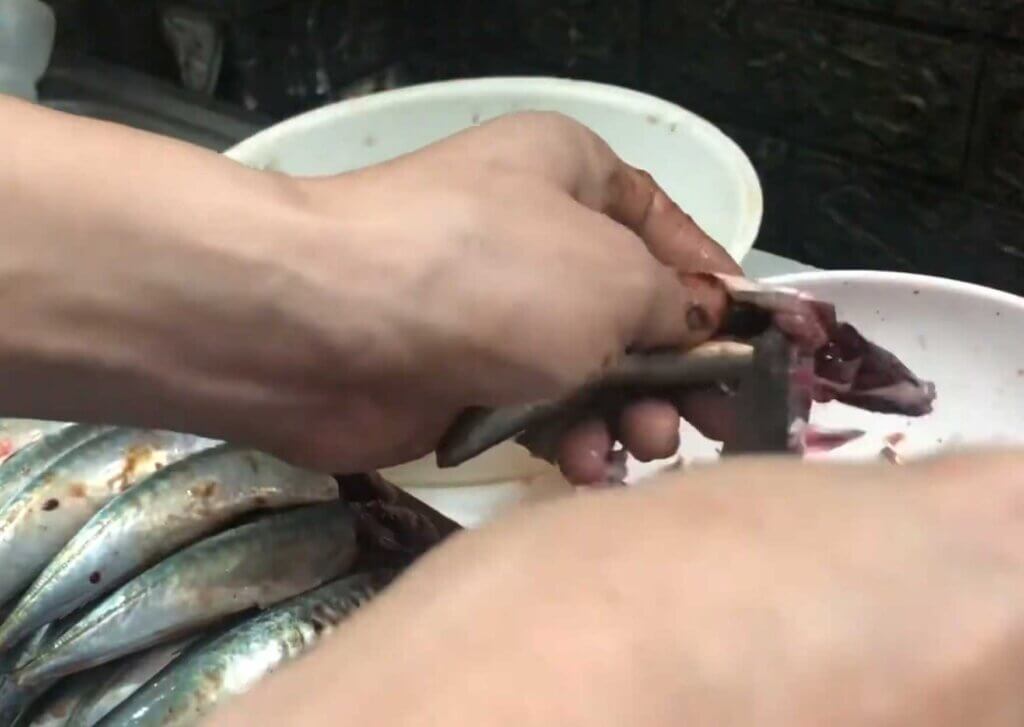 - Dùng kéo nhỏ cắt bỏ phần đuôi và mang cá bằng cách cắt sát vào đầu, kéo mang ra cùng với máu đông bên trong. Nếu mang đã được làm sạch sẵn (như từ Sài Thành Foods), bước này có thể bỏ qua.